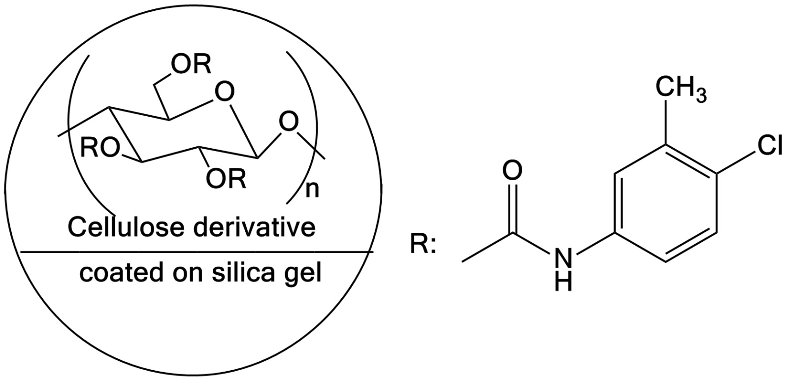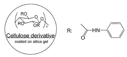纖維素型是使用最廣泛的手性柱之一,纖維素型手性色譜柱的分離作用包括相互吸引的作用及形成包埋復(fù)合物。它們屬于Wainer分類中的第2種類型。市售的手性色譜柱為微晶三醋酸基、三安息香酸基、三苯基氨基酸鹽纖維素固定相。很多化合物可通過此類型的色譜柱得到分離。這種類型的手性色譜柱種類也很齊全。流動相使用低極性溶劑,典型的流動相為異丙醇-正己烷混合物。這類柱子根據(jù)制作工藝,分為涂敷與鍵合兩大類。但特別要注意由于氯可以使涂敷纖維素從硅膠上脫落,因此要確保涂敷類柱子流動相中無含氯溶劑。