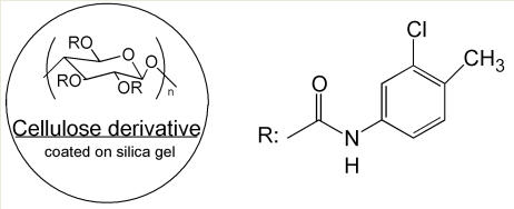 纖維素型是使用最廣泛的手性柱之一,纖維素型手性色譜柱的分離作用包括相互吸引的作用及形成包埋復(fù)合物。它們屬于Wainer分類中的第2種類型。市售的手性色譜柱為微晶三醋酸基、三安息香酸基、三苯基氨基酸鹽纖維素固定相。很多化合物可通過此類型的色譜柱得到分離。這種類型的手性色譜柱種類也很齊全。流動(dòng)相使用低極性溶劑,典型的流動(dòng)相為異丙醇-正己烷混合物。這類柱子根據(jù)制作工藝,分為涂敷與鍵合兩大類。但特別要注意由于氯可以使涂敷纖維素從硅膠上脫落,因此要確保涂敷類柱子流動(dòng)相中無含氯溶劑。