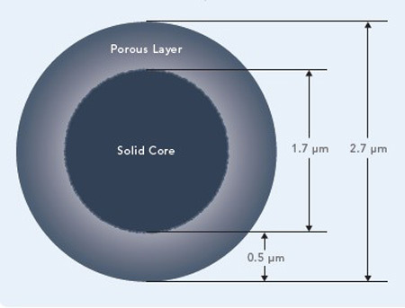 核殼顆粒是由著名色譜科學家 Jack Kirkland 教授于2006年研制成功的?!昂藲ば汀碧盍献畛跏菫榱耸筓HPLC色譜柱比常規(guī)2μm填料UHPLC色譜柱更堅固可靠。Fused-Core(核殼或熔融) 技術(shù)就是將多孔硅殼熔融到實心的硅核上面而制備出的。這些多孔的“光環(huán)”狀顆粒具有極小的粒徑分布和擴散路徑,可以同時減小軸向和縱向擴散,減小峰寬,提高柱效。核殼技術(shù)被證明非常有效,因此衍生了多種不同的品牌和固定相類別,成了HPLC和UHPLC中有力的色譜工具。